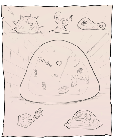 Viscous and elastic amalgams that disintegrate all organic matter that enters their bodies. Since they are slow and literally have no brain, the most efficient way to get their food is to save items inside of them and use them as bait. They can choose to reproduce multiplying their heart if they have enough mass around it. The more they eat, the bigger they become, but they are equally lethal regardless of the size. Highly moldeable and a perfect way to keep your dungeon clean.
