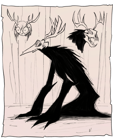 Terrifying specters that dwell in dense forests. Their bodies consist of an animal skull with antlers, from which a pure, volatile mass of spectral blackness emerges, allowing them to change shape at will and take on the image of any creature. They use their shapeshifting ability to mimic, lure, possess, and devour thinking Species. They reproduce by possessing females in order to give birth to an antlered forest animal, whose skull will form the body of a new Wendigo upon its death. They live in solitude and are greatly feared for their macabre nature.